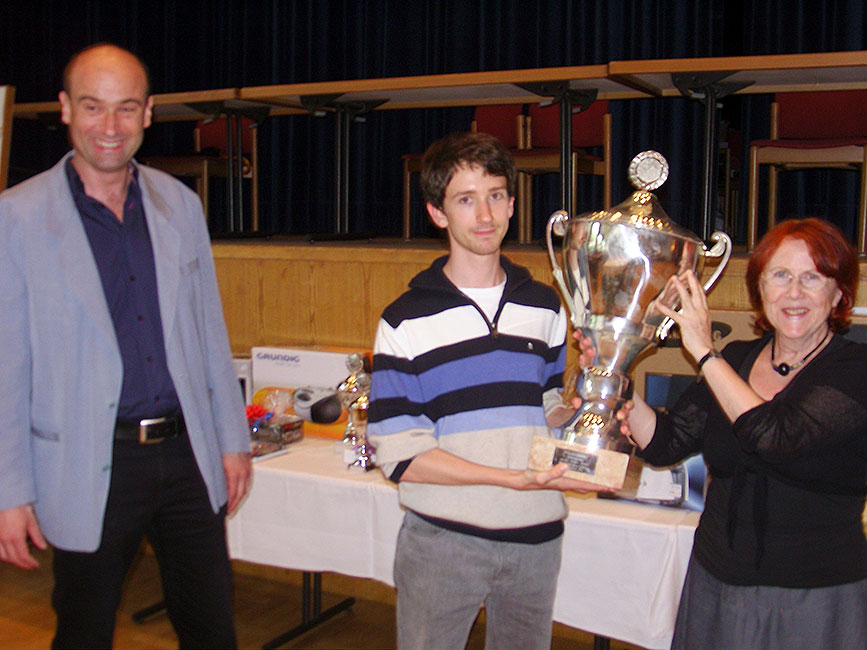 Schachklubvorsitzender Bèla Arnoczky, Pokalsieger Phillip Häußler, 2. Bürgermeisterin Heidi Benda (Foto. SK Bad Aibling e.V.)